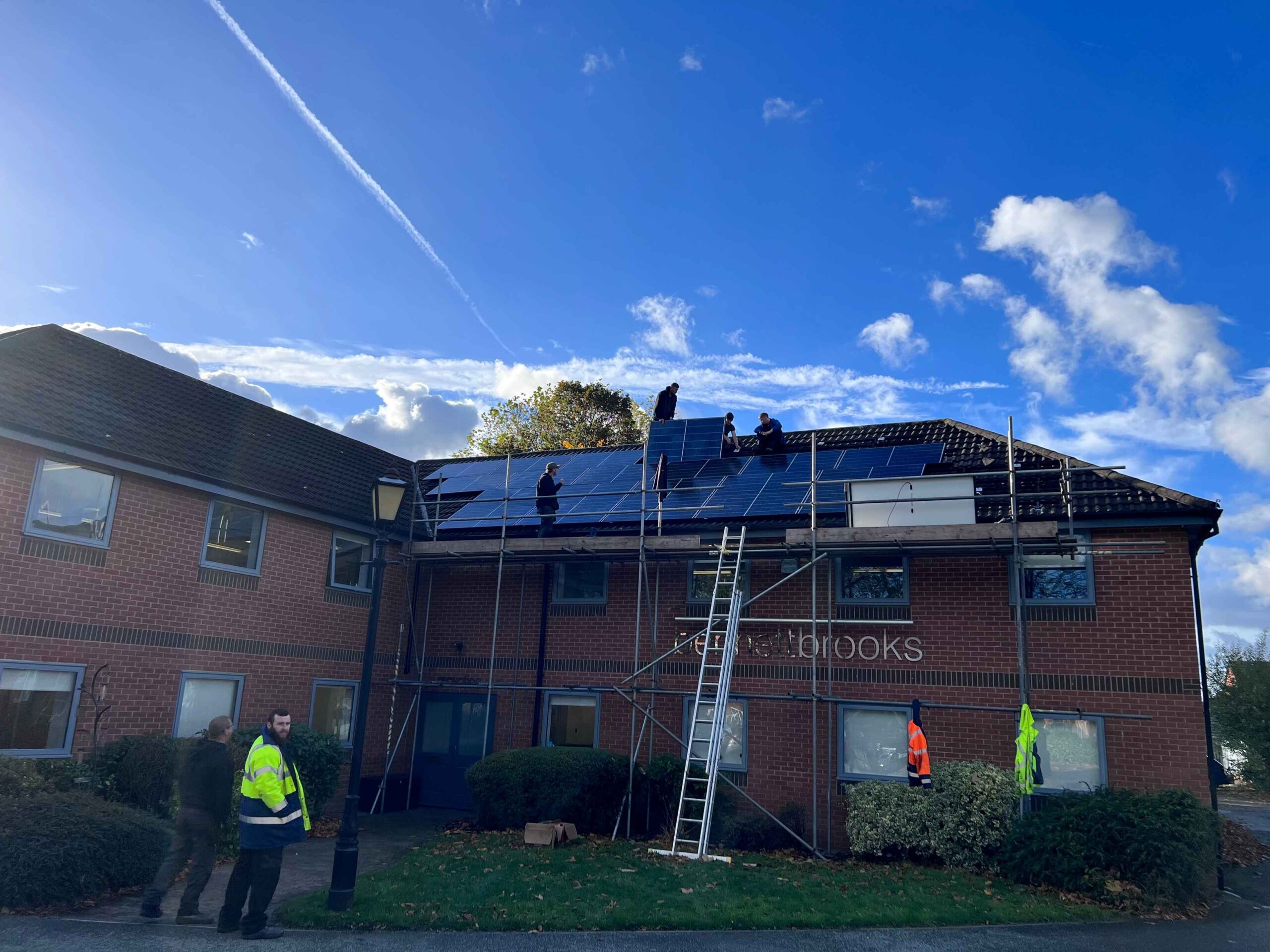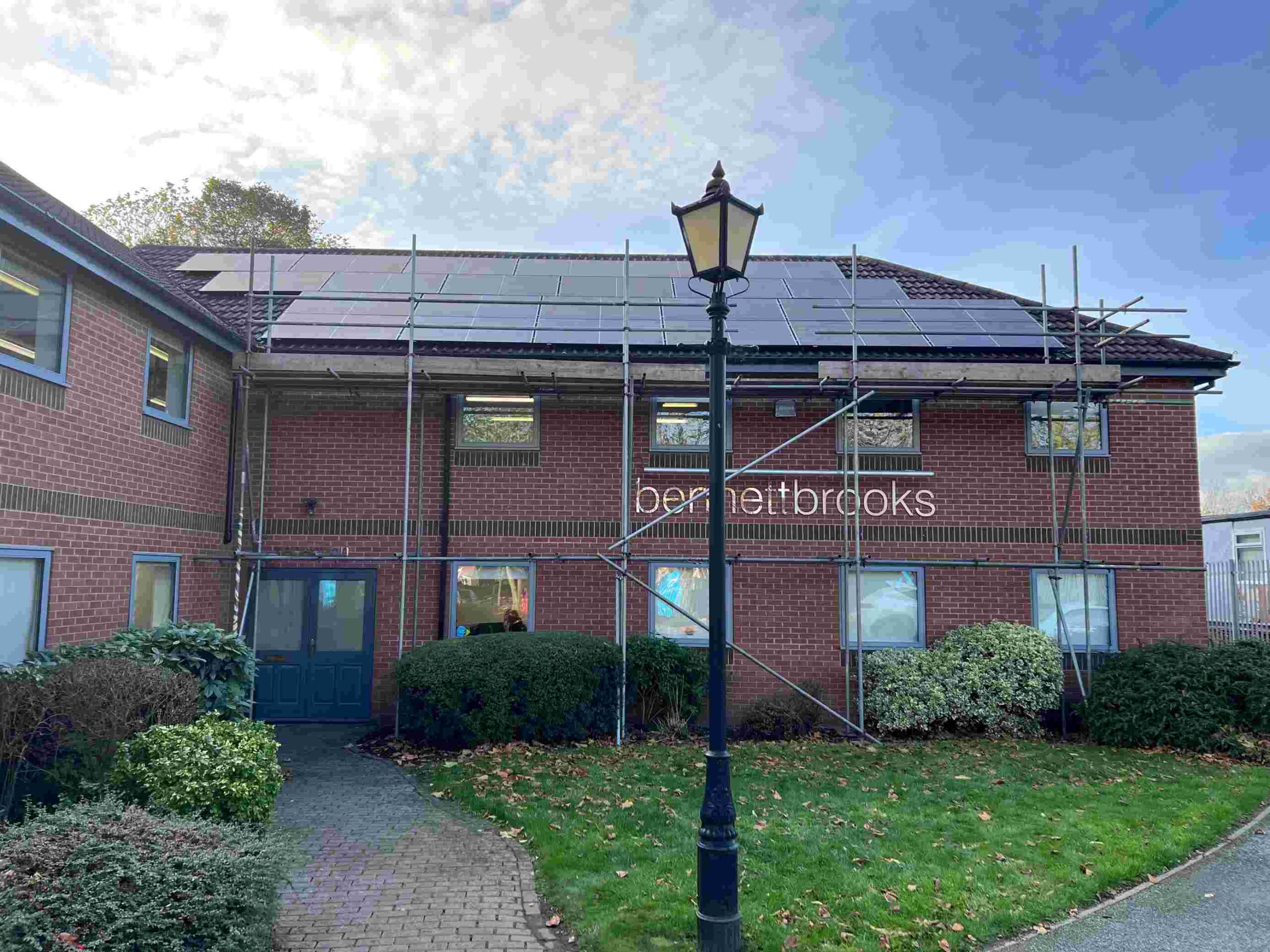 The scaffolding was set up all across the full front of the building from the front door and reception and along to the opposite end by the rear car park access, and also at the rear across the extension, in order to ensure we made maximum use of all the roof area that is most exposed to the suns rays during the day.